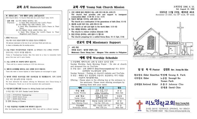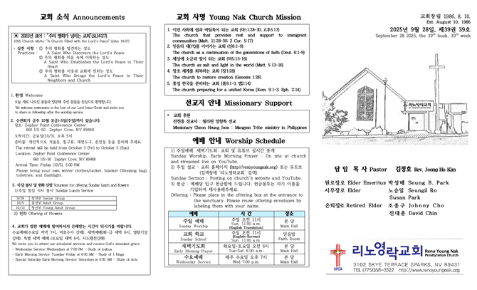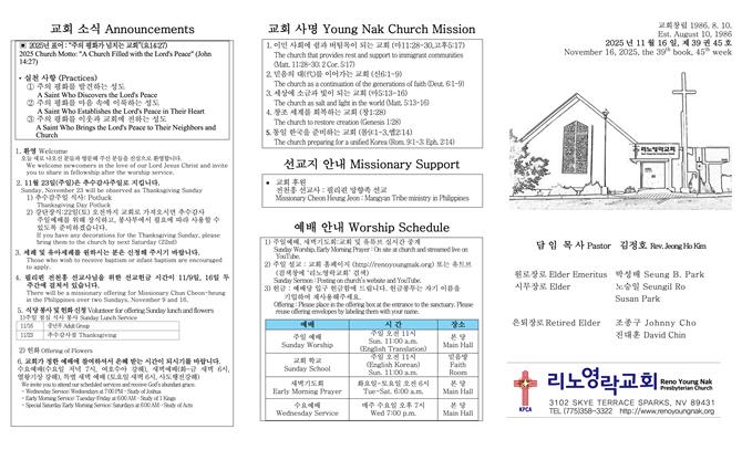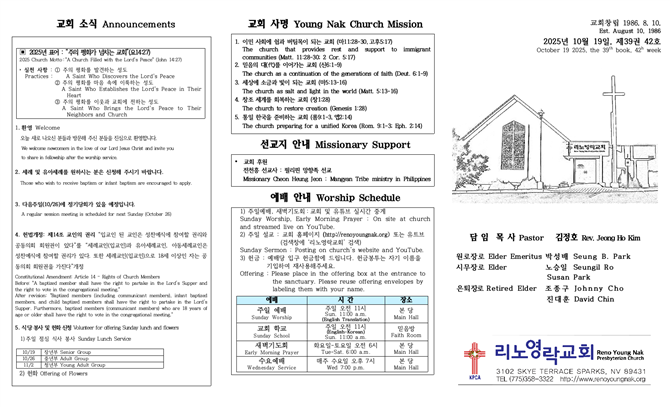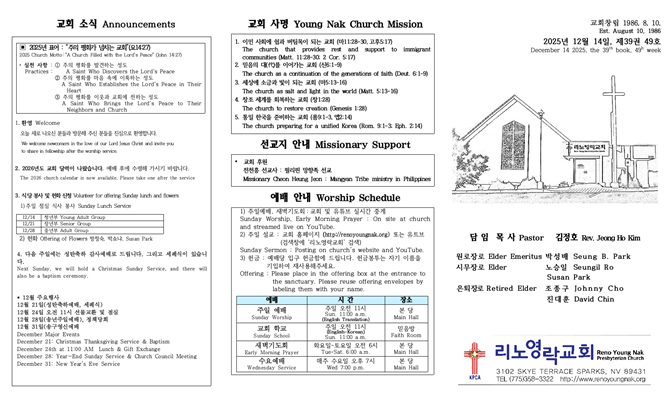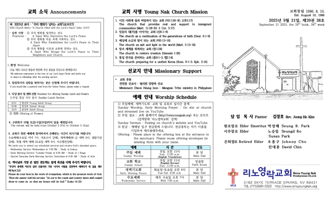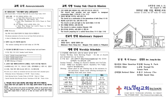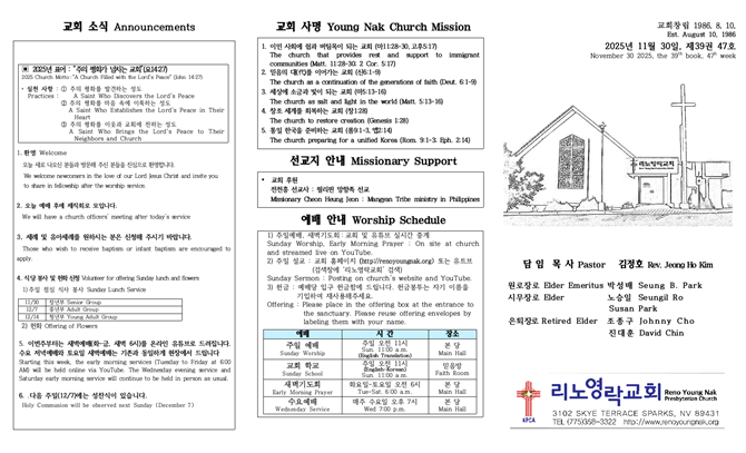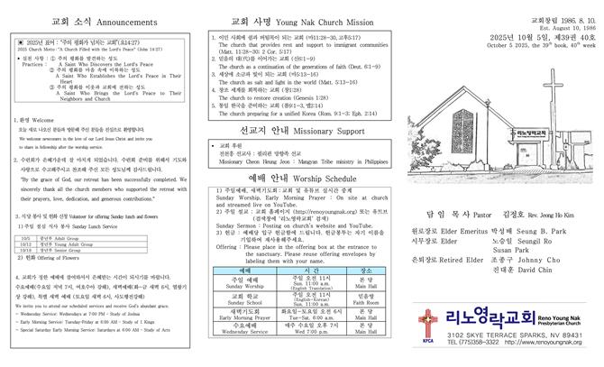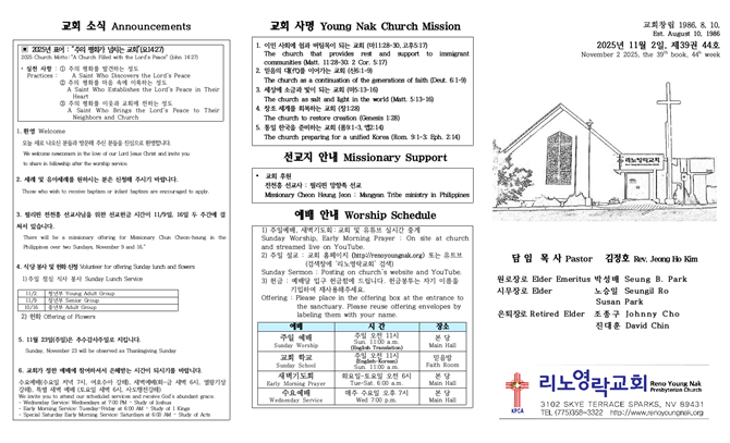RENO YOUNG NAK PRESBYTERIAN CHURCH 3102 SKYE TERRACE, SPARKS, NV. 89431 • TEL (775) 358-3322 COPYRIGHT © 2015-2025 RENOYOUNGNAK.ORG ALL RIGHTS RESERVED |